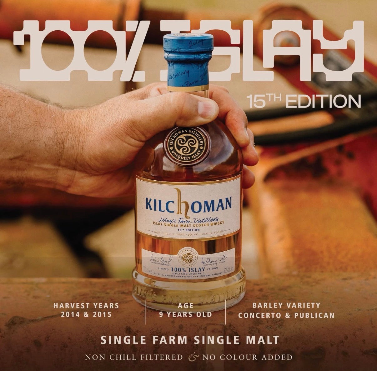 Mit der 100% Islay-Abfüllung bekennt sich Kilchoman zu seiner 100% Islay-Philosophie. Diese 100% Islay-Editionen zählen sicherlich zu den spektakulärsten schottischen Single Malts, da die Edition als einziger Single Farm Single Malt veröffentlicht wird. Keine andere Brennerei nutzt eigene Gerstenfelder direkt vor den Toren der Brennerei. Jeder Produktionsschritt wird vor Ort auf Islay bei Kilchoman durchgeführt. Dies macht Kilchoman einzigartig und unvergleichbar. Die 15. Edition des Kilchoman 100% Islay wurde aus den Kilchoman Gerste-Ernten 2014 und 2015 destilliert und reifte anschließend mindestens 9 Jahre lang in 54 unterschiedlichen Ex-Bourbon Fässern. Der Single Malt präsentiert durch die sorgfältige Reifung in Ex-Bourbon Fässern intensive Noten von Karamell und Vanille, die in einem Zusammenspiel mit der natürlichen Zitrus-süße von Kilchoman und dem Islay peat-smoke harmonieren.