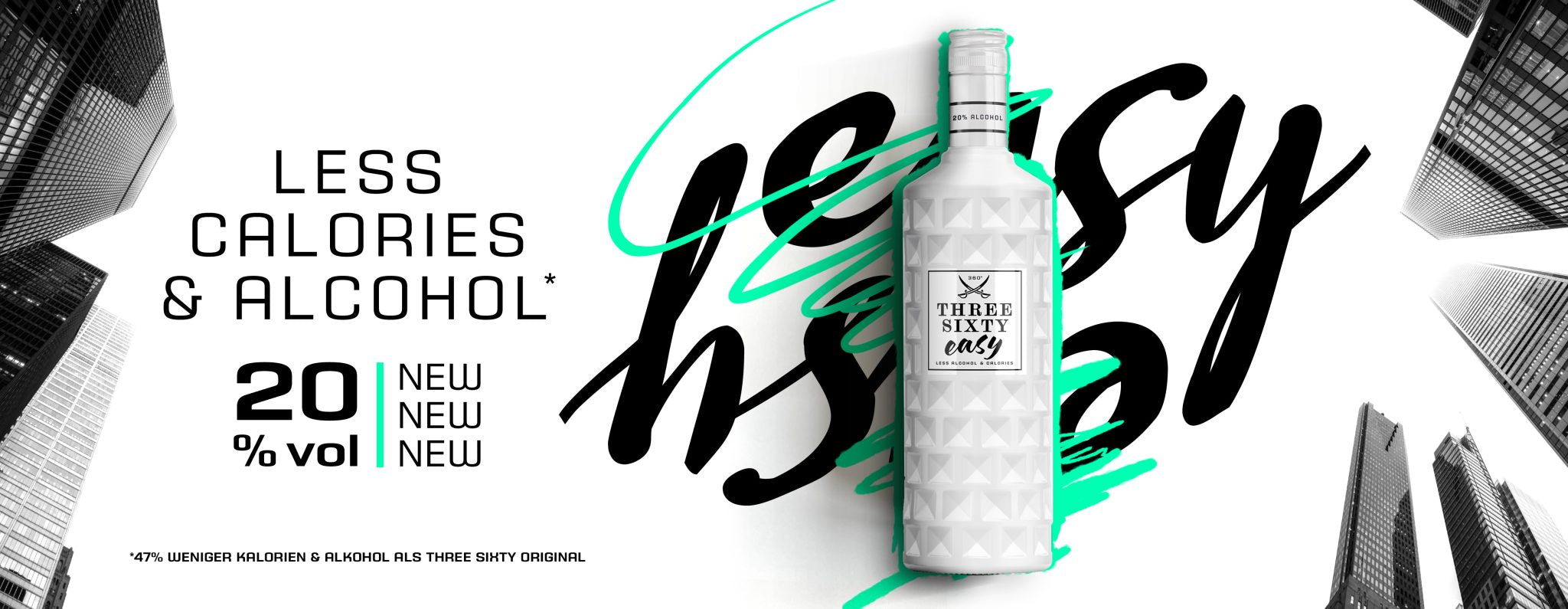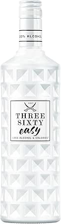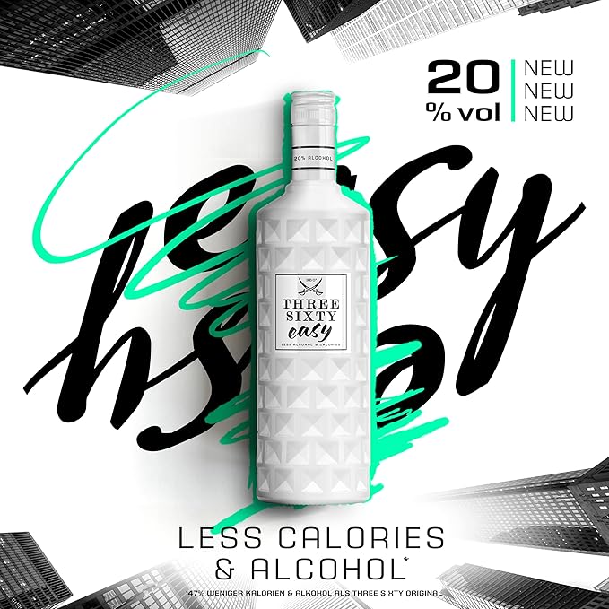 Ab jetzt wird alles easy: THREE SIXTY EASY ist die kalorienreduzierte Variante von THREE SIXTY. Mit 20% vol hat er 47% weniger Kalorien und Alkohol als THREE SIXTY Original. THREE SIXTY EASY ist mild und weich im Geschmack und eignet sich zum Mixen, sowie zum puren Genuss. THREE SIXTY EASY ist vierfach destilliert und mit der einzigartigen Diamond Filtration veredelt. Der Direktdruck auf der markanten weißen Facettenschliff-Flasche unterstreicht den Premium-Charakter des Produktes.